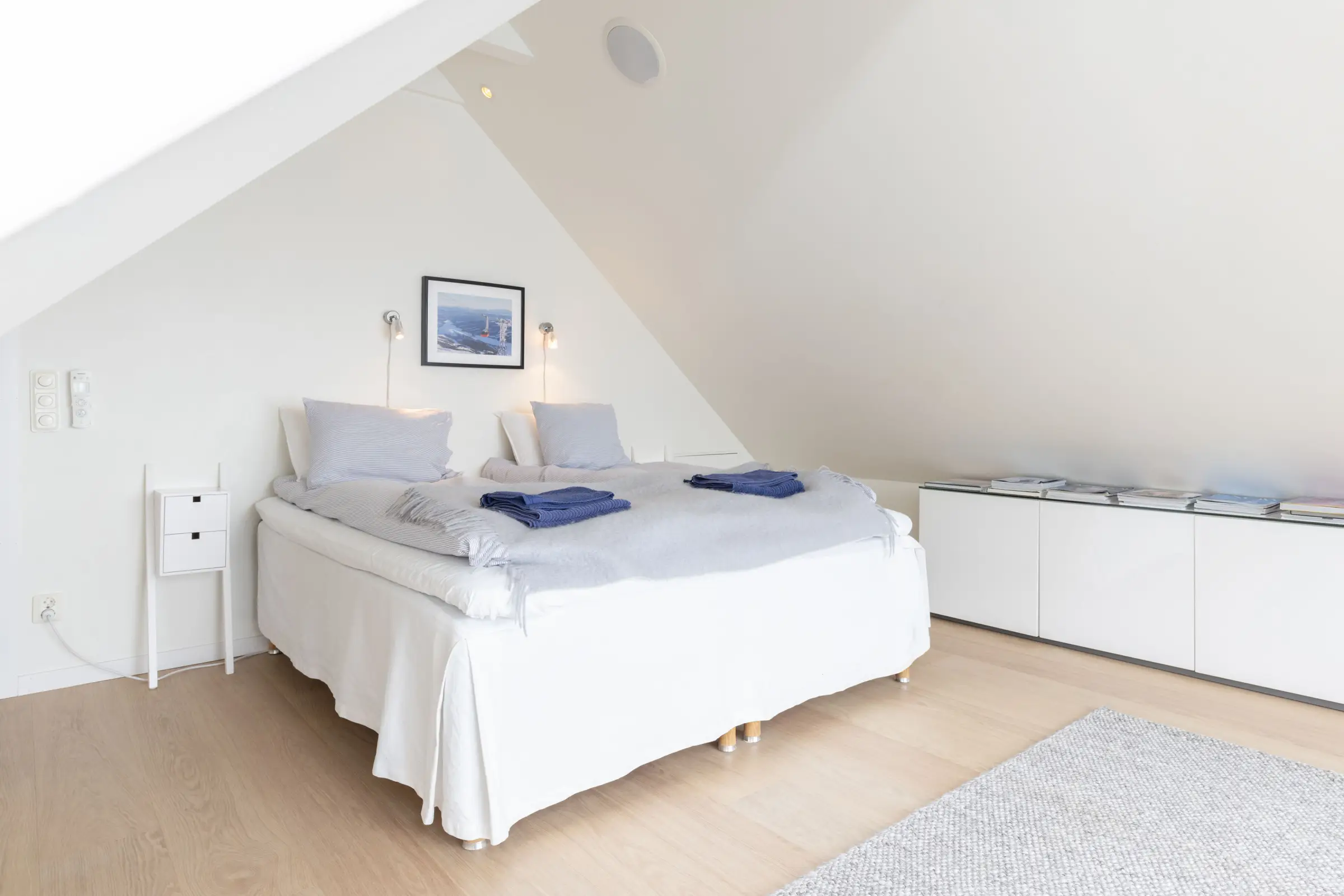 6 + 2 på sovloft. 3 dubbelsängar (180*200, 160*200, 160*200), Sovloftet: 1 dubbelsäng (160*200)