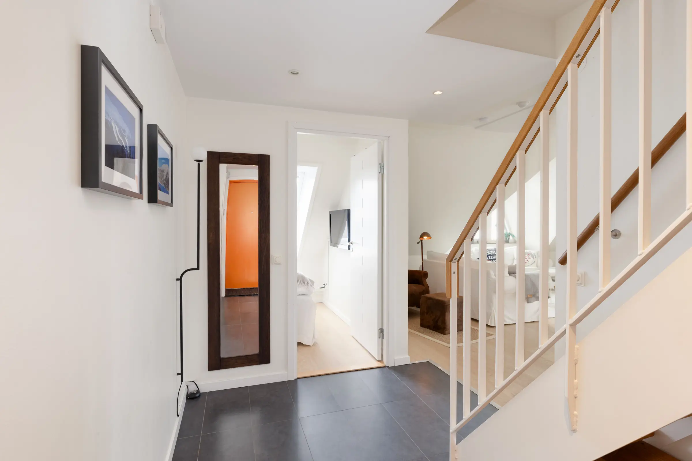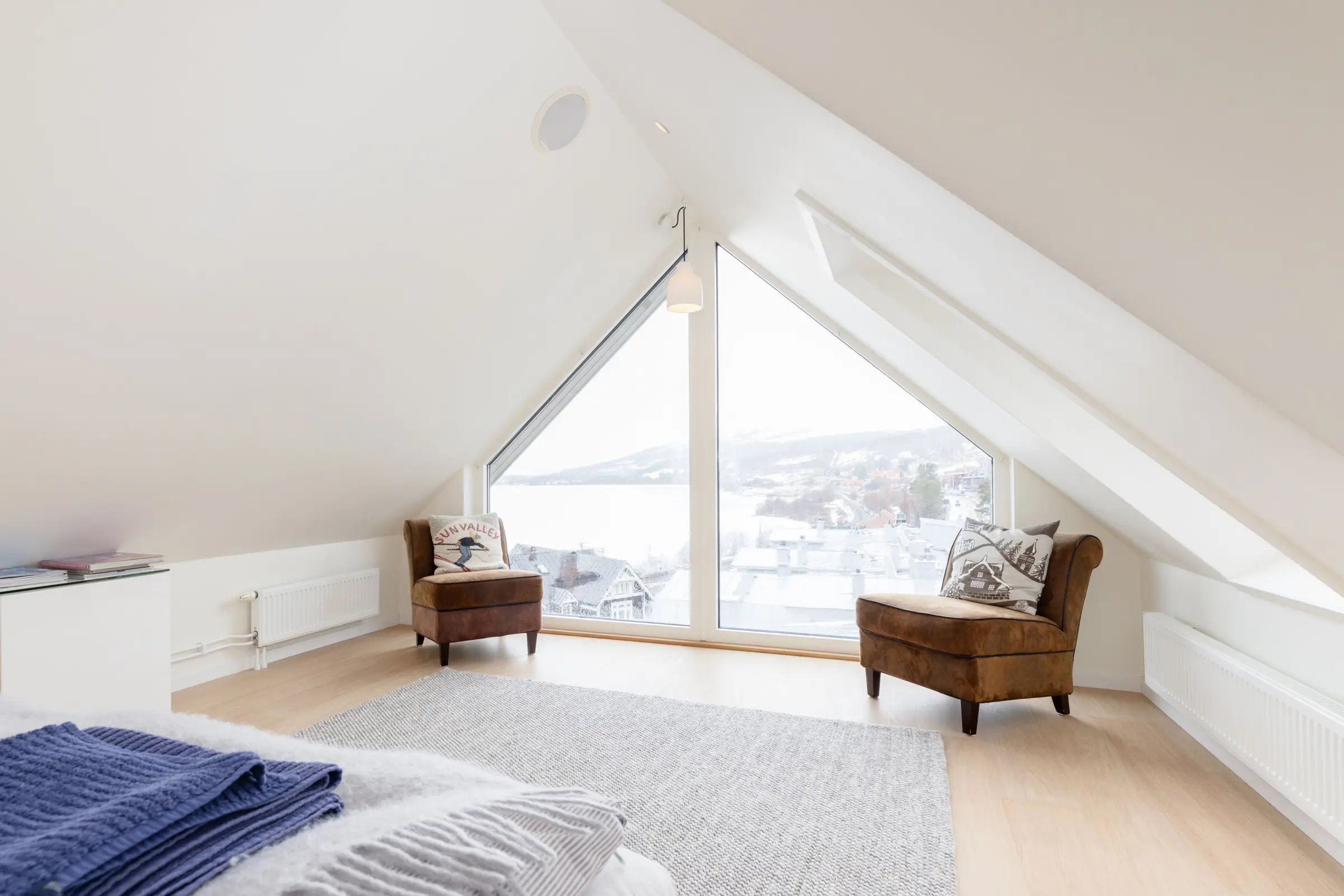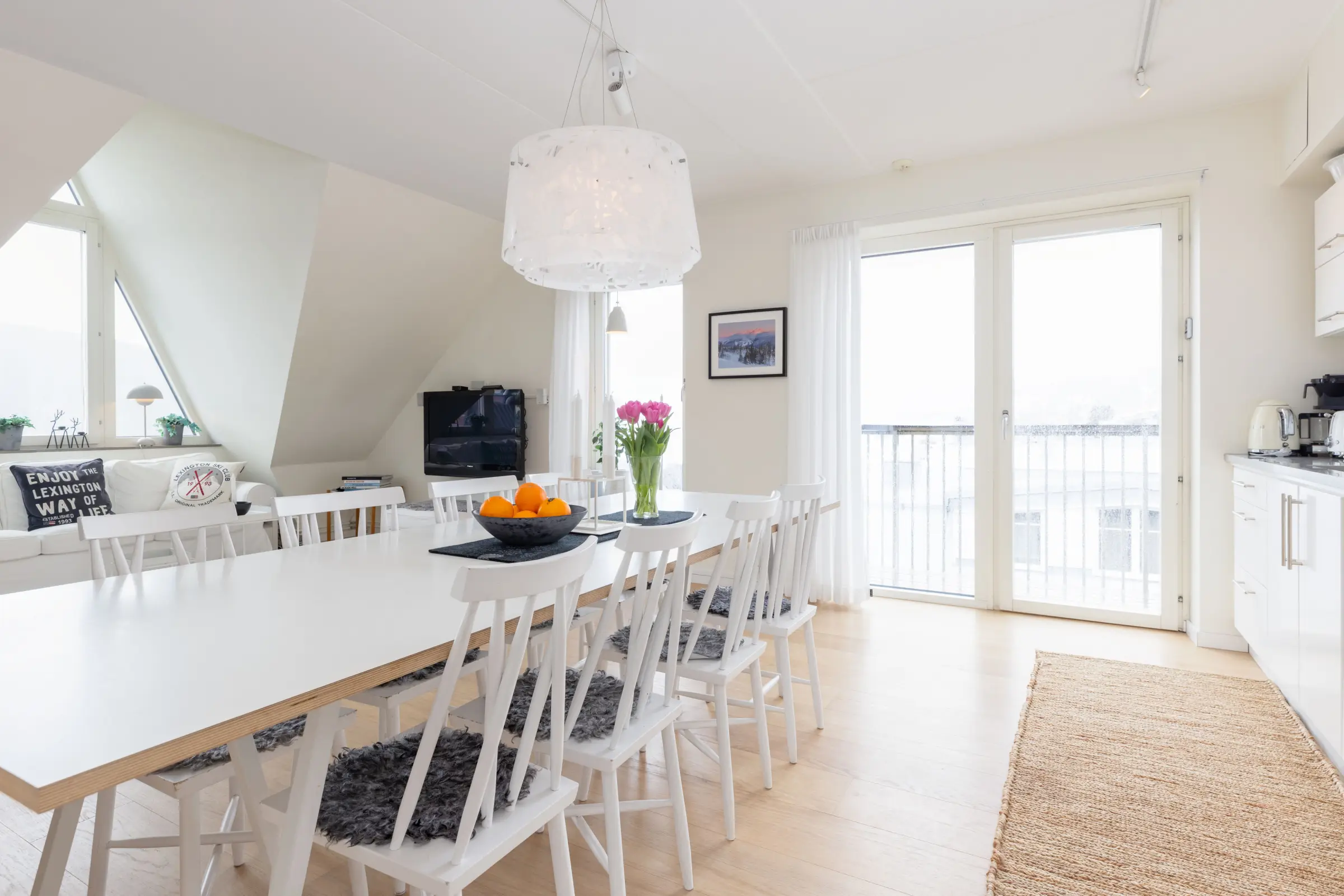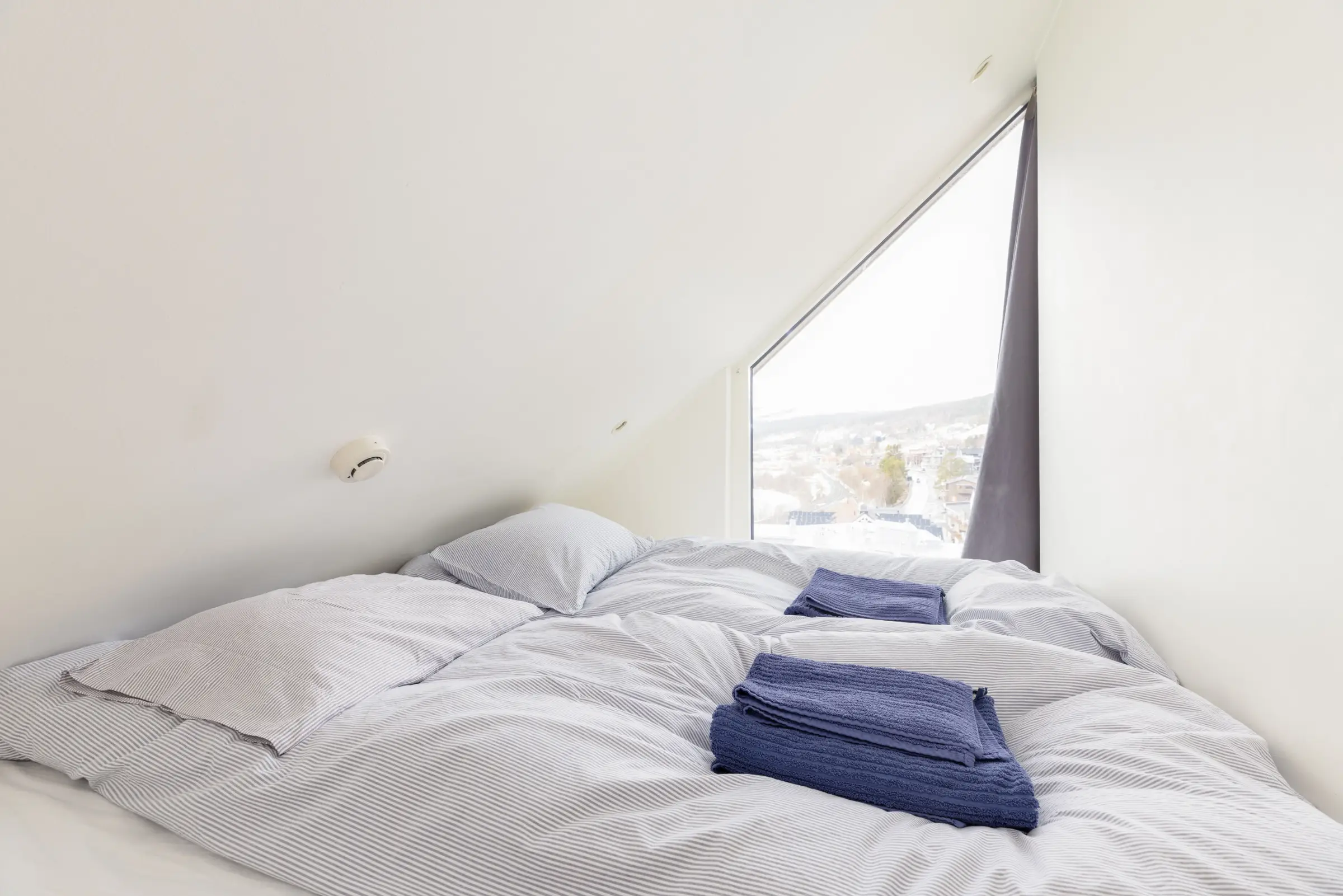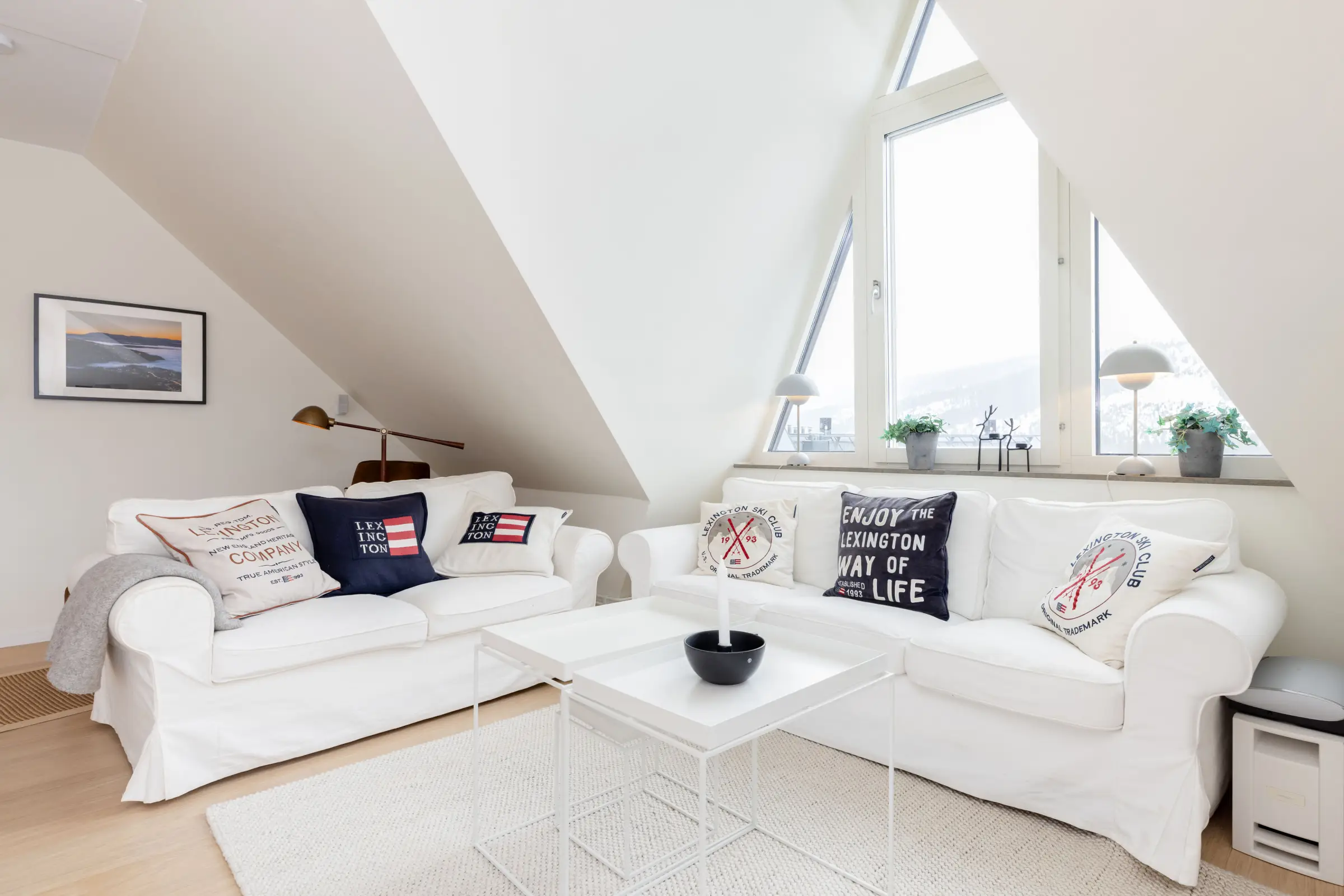 Här bor du bland takåsarna och med fönster i alla väderstreck, som låter blicken hitta ut över fjäll och sjö, och låter solen leta sig in långt över golvet. Kvällssolen magisk. Detta är vår största lägenhet, i två etage plus ett sovloft. Ett fjällnära boende bekvämt för max 8 personer i tre sovrum plus loft, två badrum, en bastu och ett stort kök med matplats och vardagsrum i en öppen stor volym.