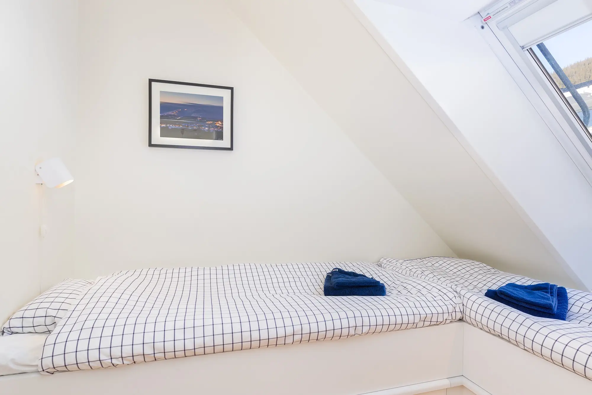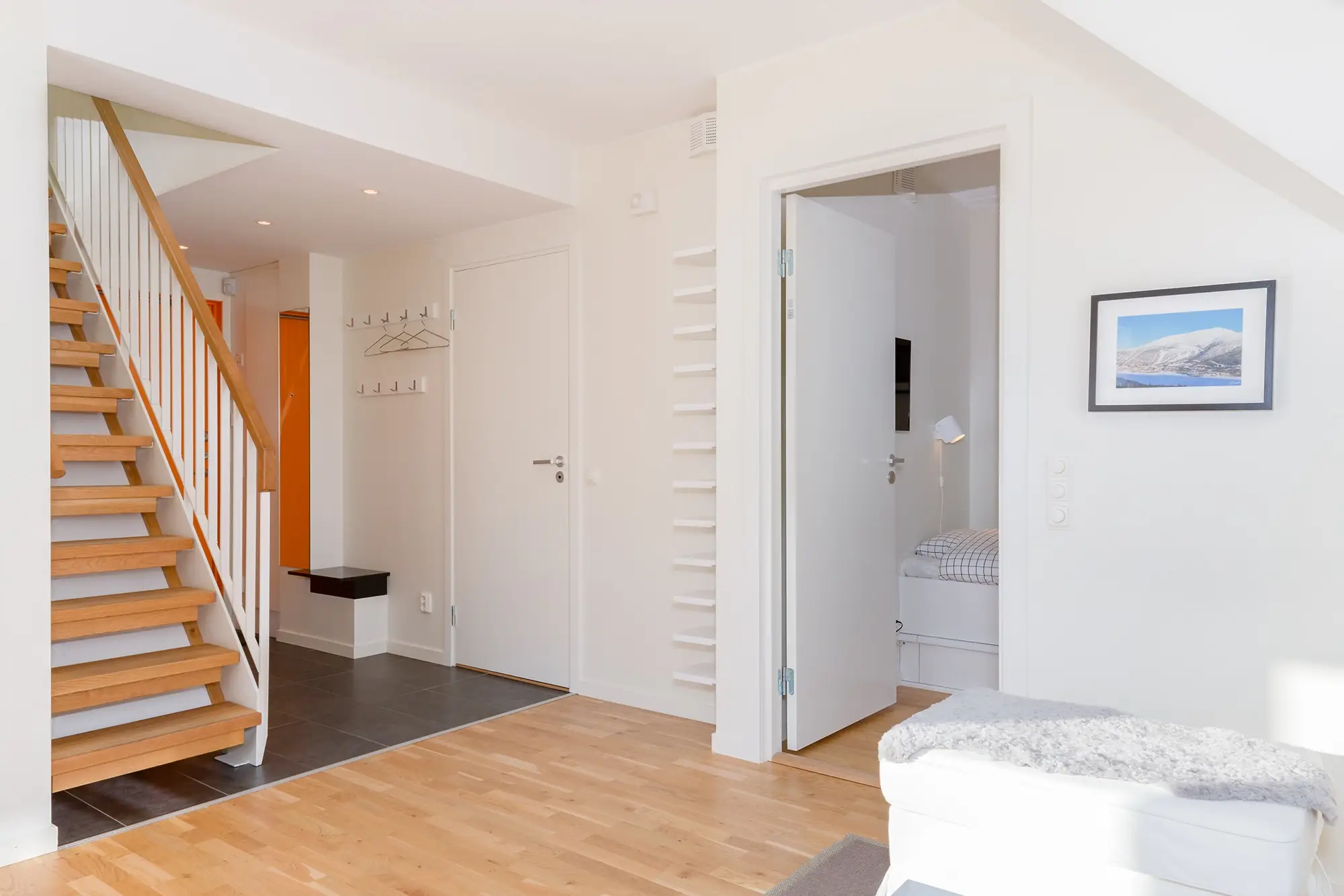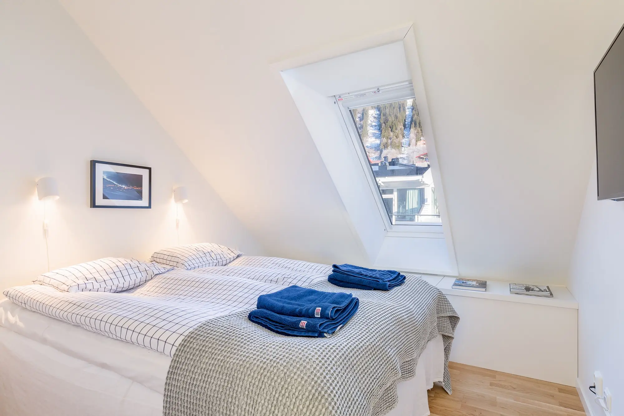 Här har ni både svängrum och luftrum högst upp i huset för max 8-9 personer i tre sovrum och två etage. All utrustning som du kan behöva för en vecka oavsett ambition i köket. Två badrum underlättar så att morgonlogistiken flyter på lika bra som liftkön i VM8:an. Även här hittar du ett eget skid- och pjäxrum på samma våningsplan högst upp i huset. Smidigt ska de vara.