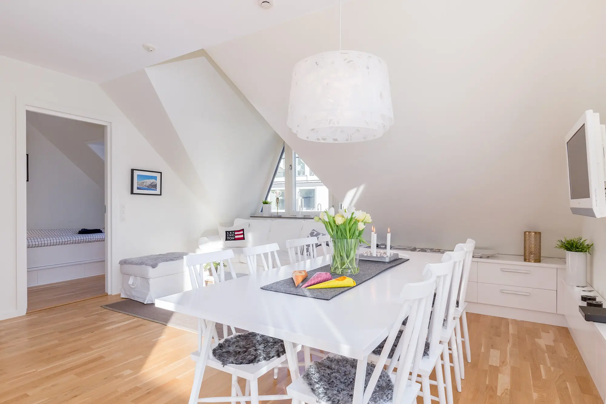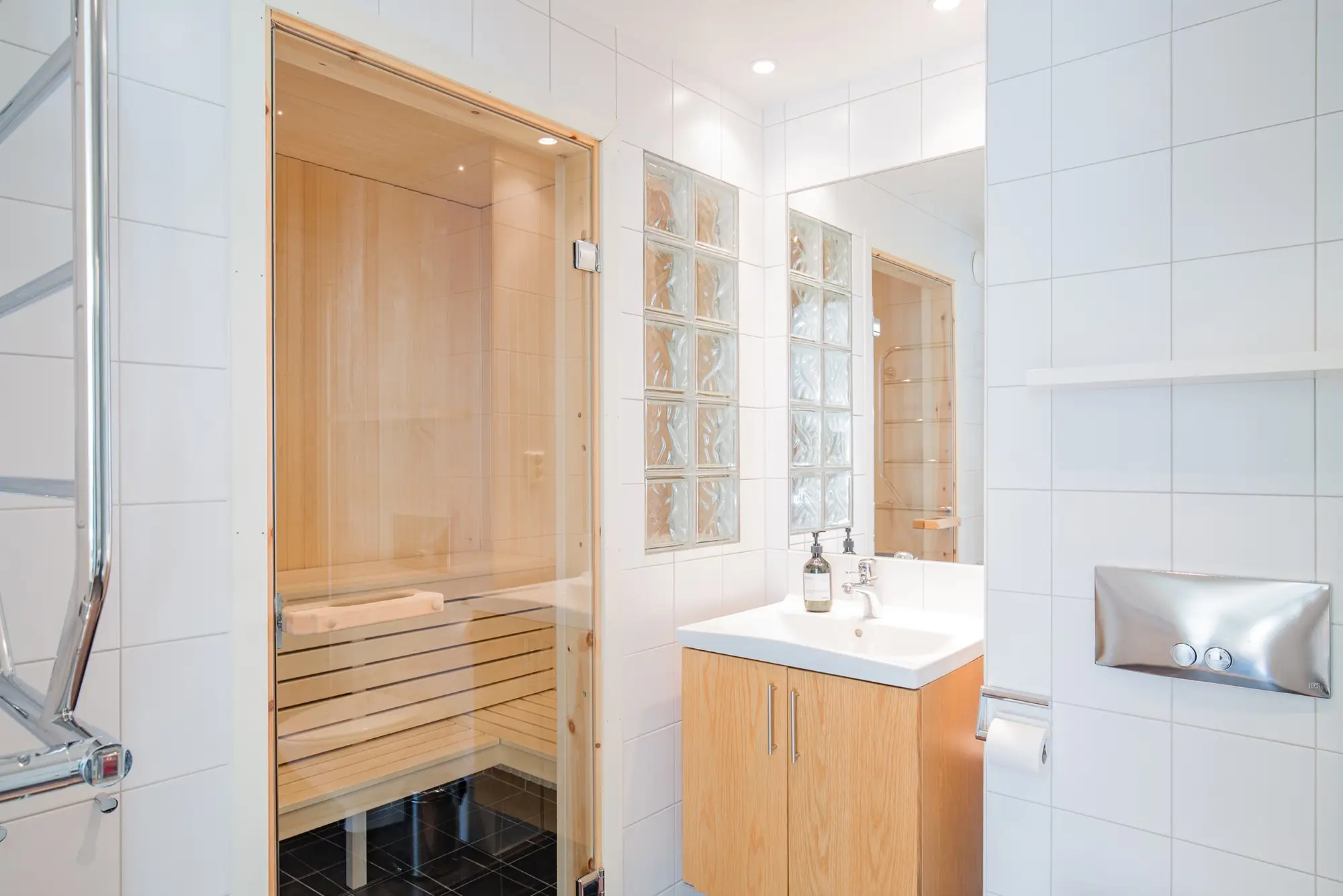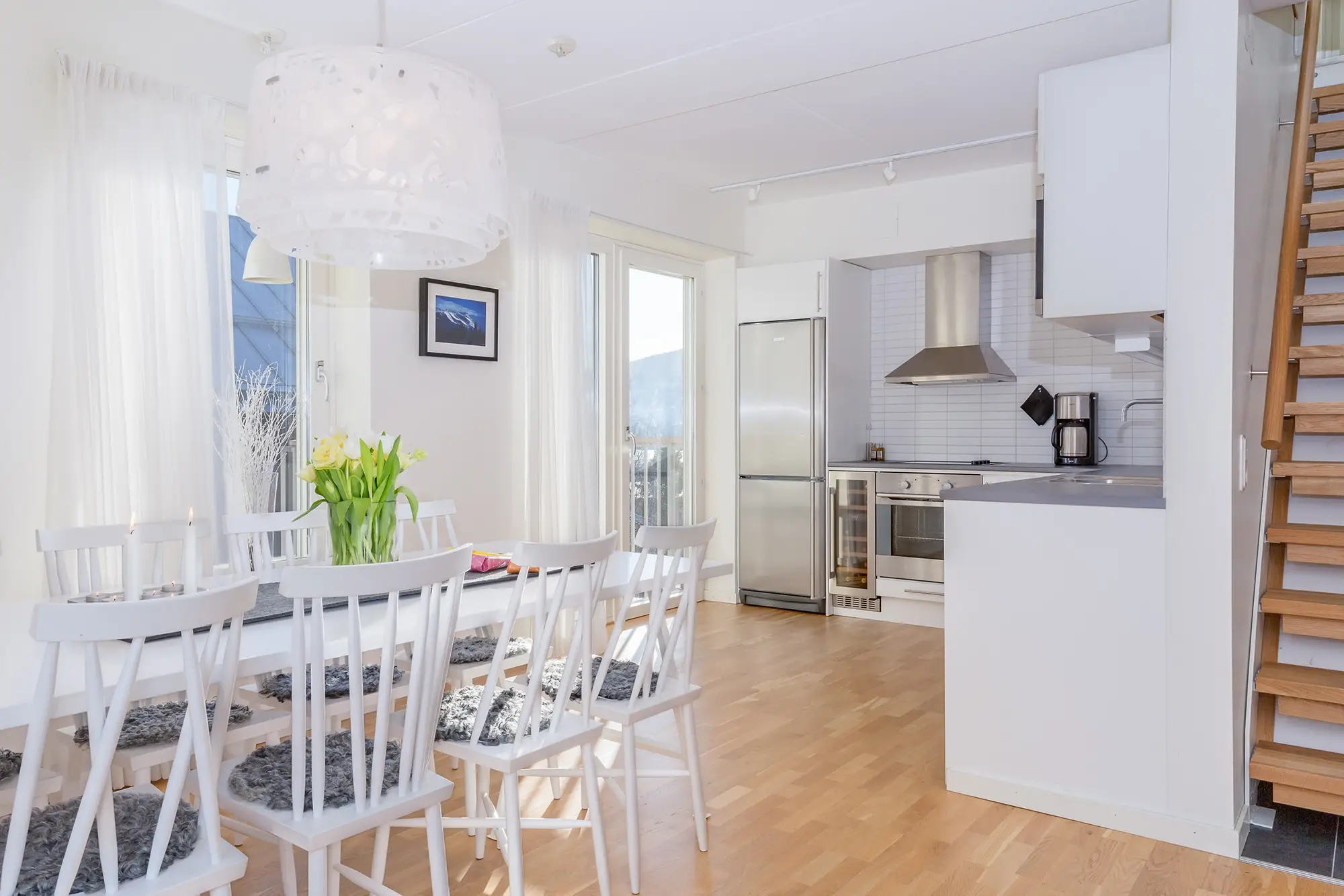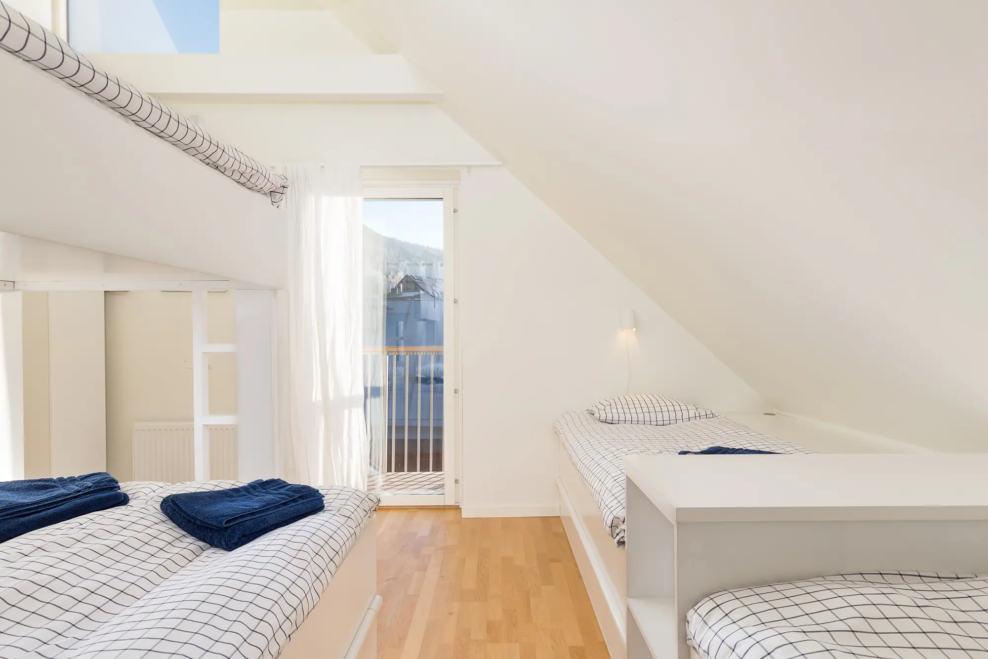 Här har ni både svängrum och luftrum högst upp i huset för max 8-9 personer i tre sovrum och två etage. All utrustning som du kan behöva för en vecka oavsett ambition i köket. Två badrum underlättar så att morgonlogistiken flyter på lika bra som liftkön i VM8:an. Även här hittar du ett eget skid- och pjäxrum på samma våningsplan högst upp i huset. Smidigt ska de vara.